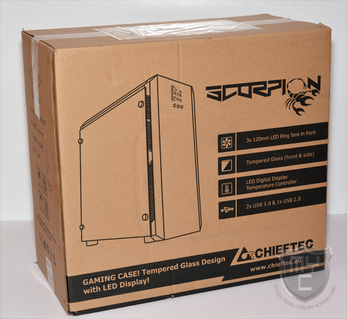 Das neue Scorpion GL-01B-OP wird von Chieftec in einer neutralen Verpackung geliefert, welche auf der Vorder- als auch Rückseite neben einer Skizze auch mit den wichtigsten Features bedruckt wurde.