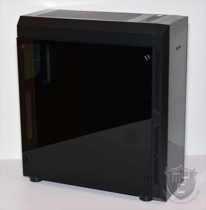 Chieftec hat das Gehäuse nicht nur auf der linken Gehäuseseite mit einer entsprechenden Echtglasseitenwand ausgestattet, sondern auch an der Gehäusefront. Die an der Gehäusefront verbaute Echtglasscheibe ist mit einer leichten Tönung versehen und ist auf der linken und rechten Seite in ein Kunststoffelement eingefasst. Die hier verbauten Kunststoffelemente erstrecken sich wie die Glasscheibe selbst vom Gehäuseboden bis zur Gehäuseoberseite.