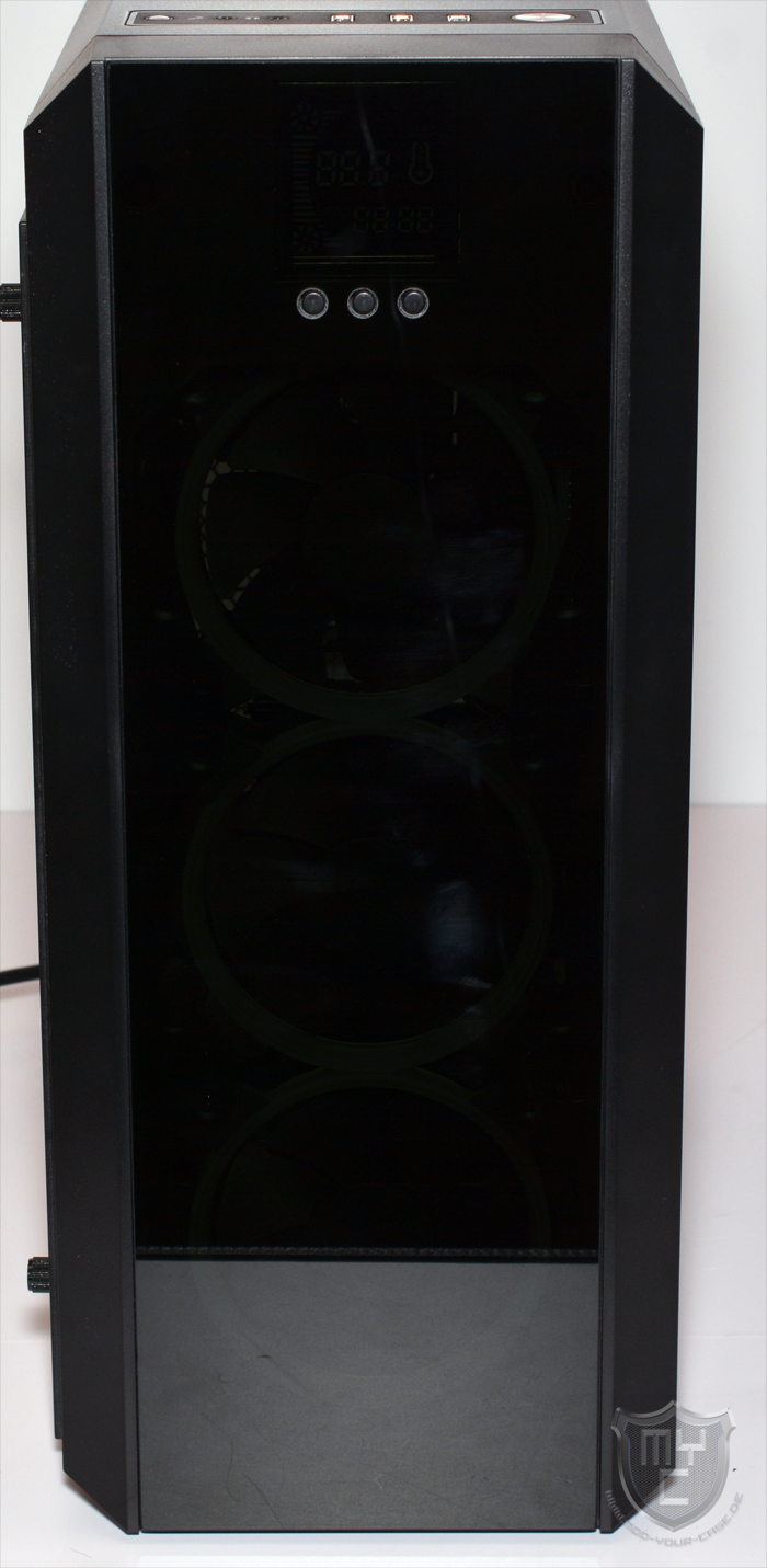 Die seitens Chieftec eingesetzten Echtgleichscheiben sind im Vergleich zu den Echtglasscheiben, welche man von vielen anderen Herstellern her kennt, mit einer deutlich geringeren Tönung versehen wurden, wodurch man auch ohne eine im Gehäuseinneren eingeschaltete Beleuchtung schon die drei hinter der Gehäusefront verbauten 120-mm-Lüfter erkennen kann.