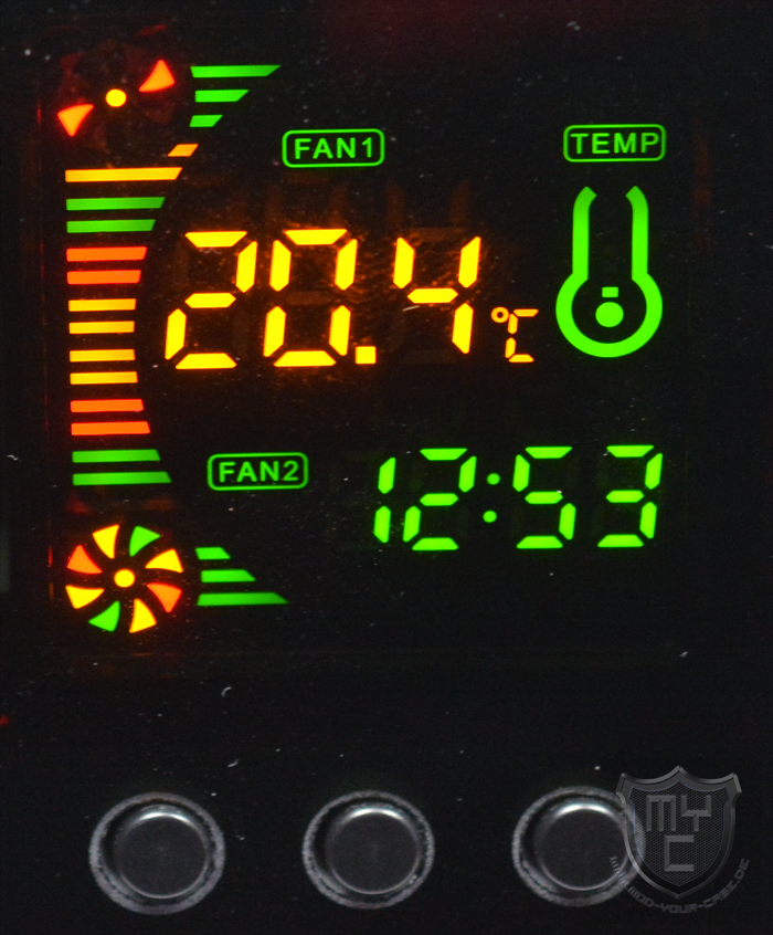 Schaltet man das System ein, so wird einem hier nicht nur die im Gehäuse herrschende Temperatur angezeigt, sondern auch die aktuelle Uhrzeit. Auf Wunsch kann einem anstelle der aktuellen Uhrzeit auch die Bootzeit sowie ein Timer angezeigt werden.