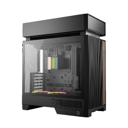 Das CL6600 verfügt über eine Frontblende in voller Höhe, die den direkten Luftstrom in das Gehäuse maximiert, sodass große Mengen an Frischluft mit minimalem Widerstand in das System gelangen können. Akzente aus echtem Holz verleihen dem Äußeren eine natürliche Note.