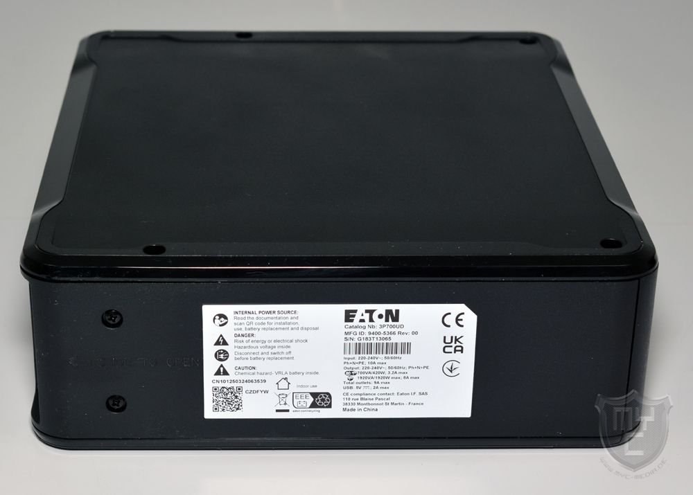 Die 3P Ellipse 700 USB DIN USV lässt sich jedoch nicht nur an dieser Stelle öffnen, sondern Eaton hat auch den Gehäuseboden, welcher mit einem Typenschild versehen wurde, mittels zwei Schrauben am Gehäuse fixiert.