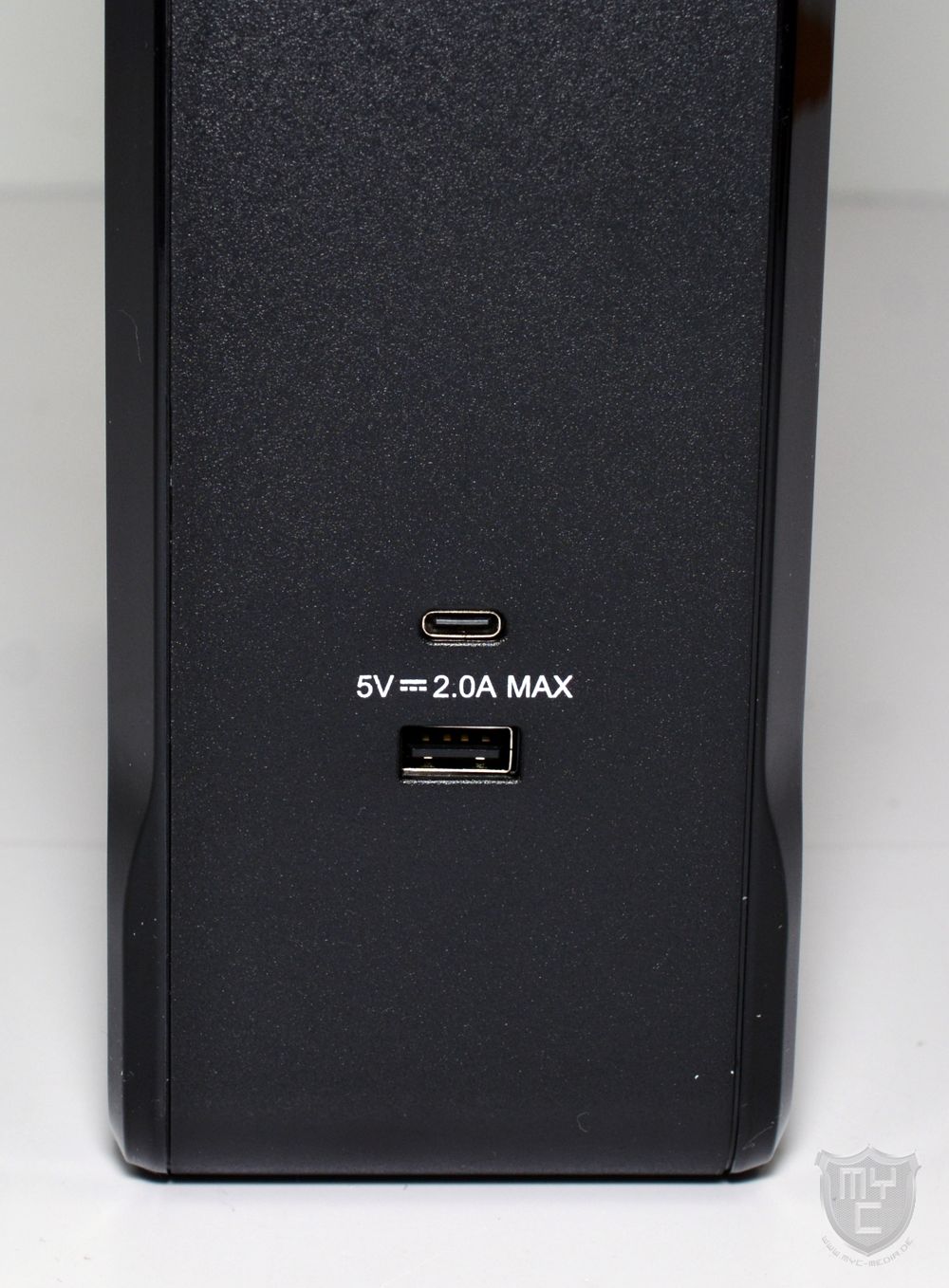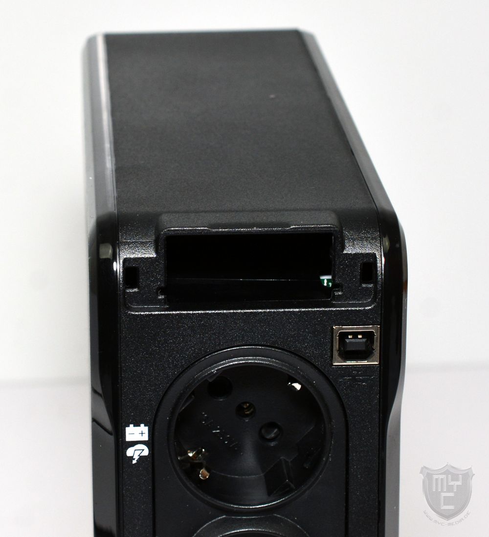 Im unteren Bereich wurde die USV an der Gehäusefront mit zwei USB-Anschlüssen ausgestattet. Mittels der gebotenen Ausgangsleistung von 2 Ampere lassen sich über diese USB-Anschlüsse wahlweise Smartphones oder andere kompatible Geräte aufladen. Die USB-Anschlüsse dienen jedoch nicht nur zum Aufladen kompatibler Geräte, sondern können auch zum Anschluss einer Smart Home Zentrale etc. dienen.