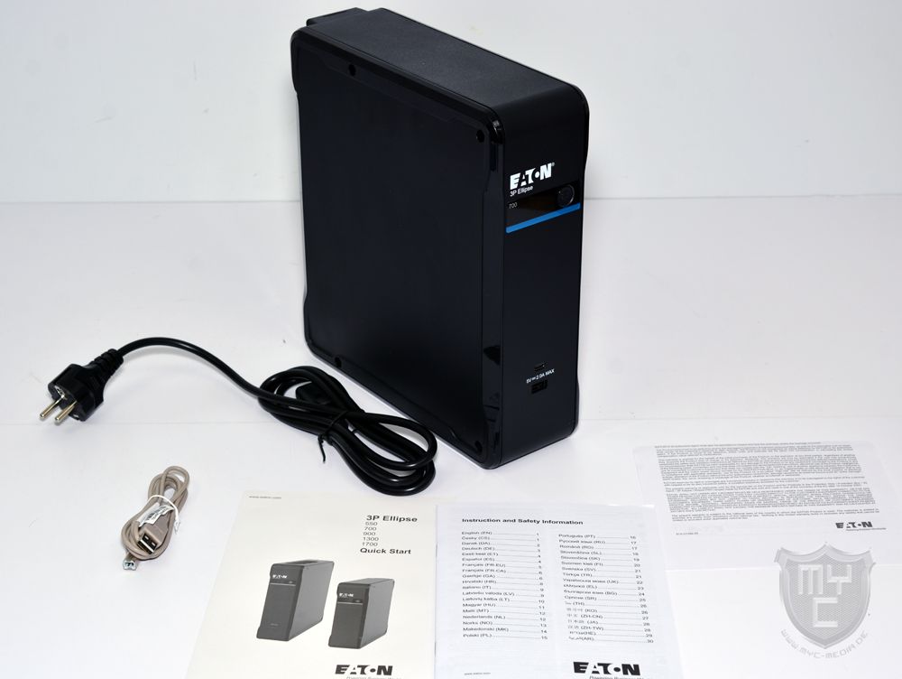 Die 3P Ellipse 700 USB DIN wird von Eaton in einer weiß/blauen Verpackung geliefert, welche auf der Vorderseite neben einem Produktbild und den wichtigsten Features auch mit einem Hinweis auf die möglichen Einsatzgebiete sowie die gebotene Ausgangsleistung bedruckt wurde.