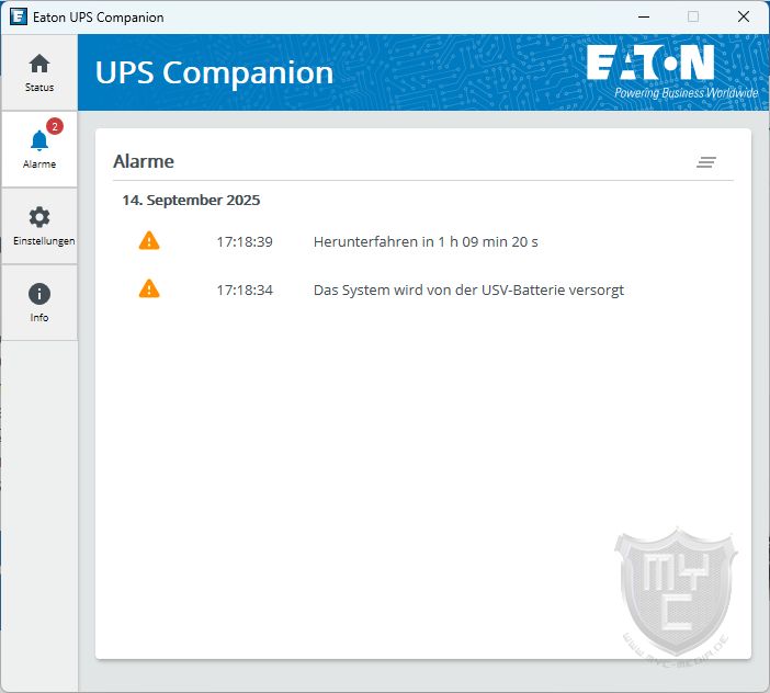 Im Falle eines Stromausfalls oder einer Stromschwankung, welche dafür sorgt, dass die USV automatisch eingreift und in den Batteriebetrieb wechselt, wird einem dies im linken, immer sichtbaren Menü der Software angezeigt. Während man im Softwareabschnitte “Alarme” genauere Details angezeigt bekommt, ertönt aus der USV heraus ein wiederkehrender Warnton.