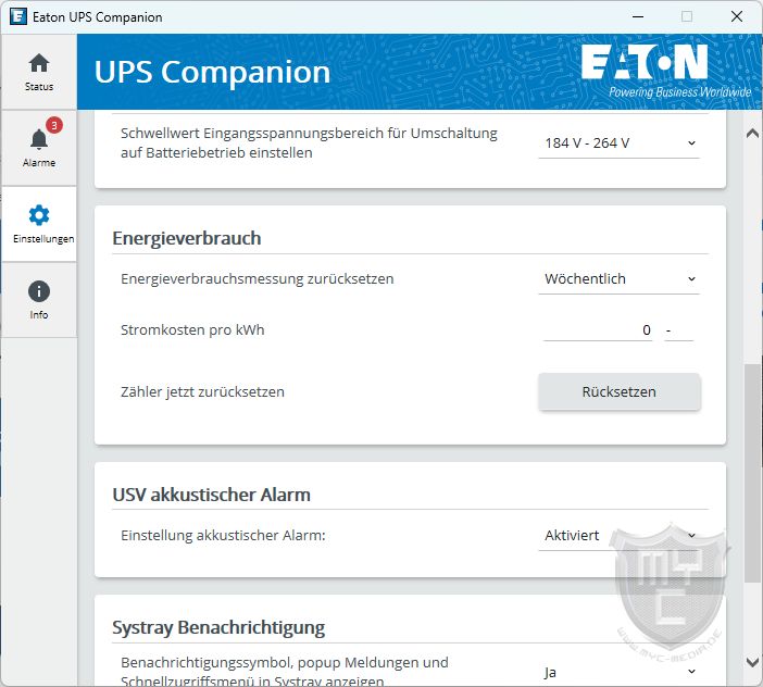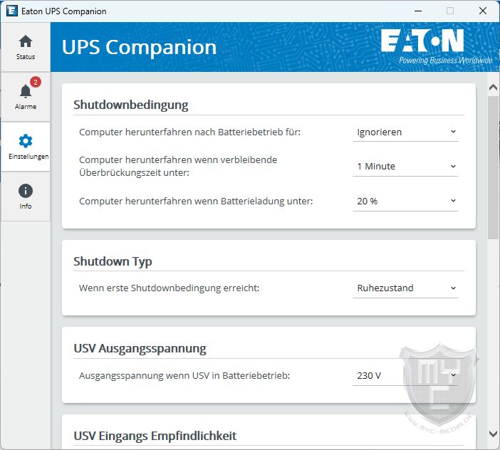 Was bei einem Stromausfall passieren soll und in welchem Spannungsbereich die USV in den Stützbetrieb gehen soll, kann man im Bereich “Einstellungen” einstellen.