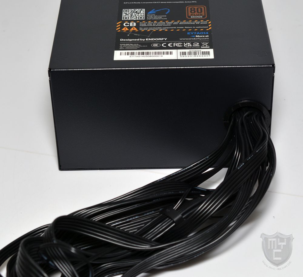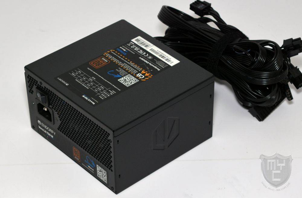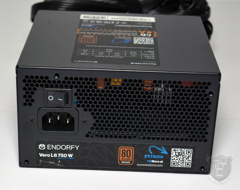 Mit einem Blick auf die Netzteilrückseite findet man einem Aufbau vor, welchen man in der Zwischenzeit immer weniger am Markt sieht. Anders, als man es von den meisten aktuellen und auch auf den Gaming-Bereich ausgelegten Netzteilen am Markt her kennt, setzte ENDORFY bei dem Vero L6 750 W nicht auf einen teil- oder vollmodularen Aufbau, sondern alle Anschlusskabel sind fest mit dem Netzteil verbunden.