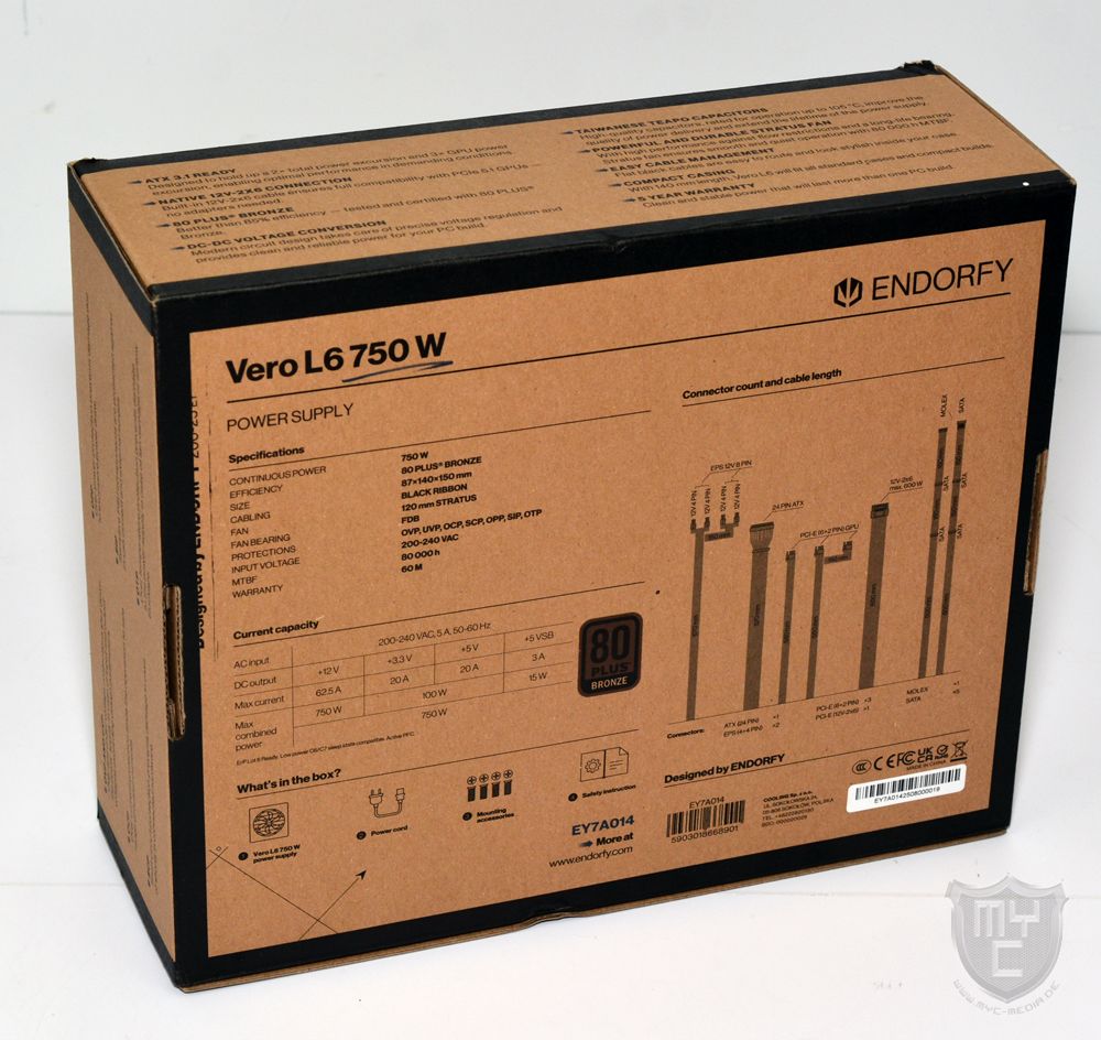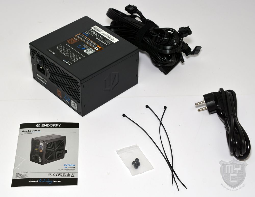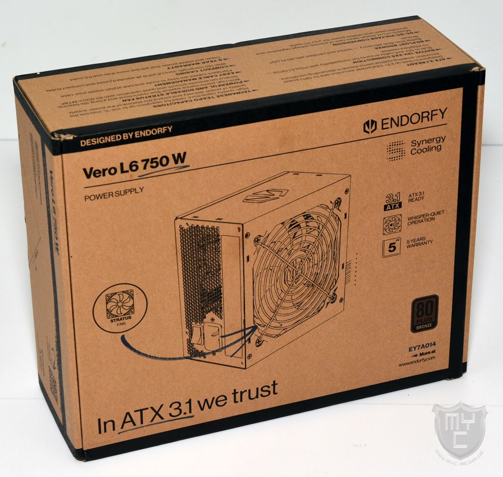 Das Vero L6 750 W wird von ENDORFY in einer neutralen Verpackung geliefert, welche auf der Vorderseite neben einem skizzierten Produktbild auch mit der Modellbezeichnung sowie einem Hinweis auf die gebotene Effizienz bedruckt wurde.