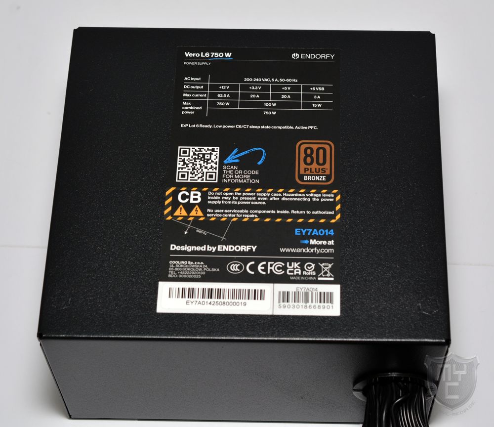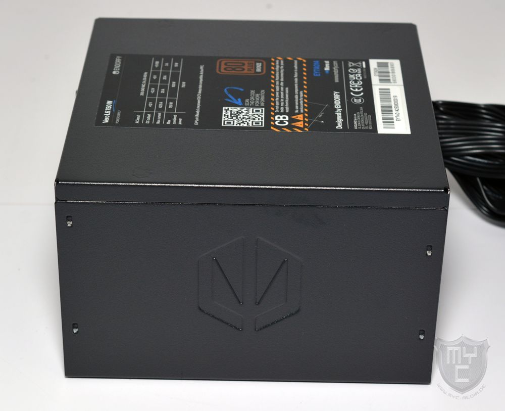Mit einem Blick auf die Gehäuseoberseite findet man einen Aufkleber vor, welcher einem einen Überblick über die wichtigsten Leistungsdaten sowie die Effizienz des Netzteils gibt.