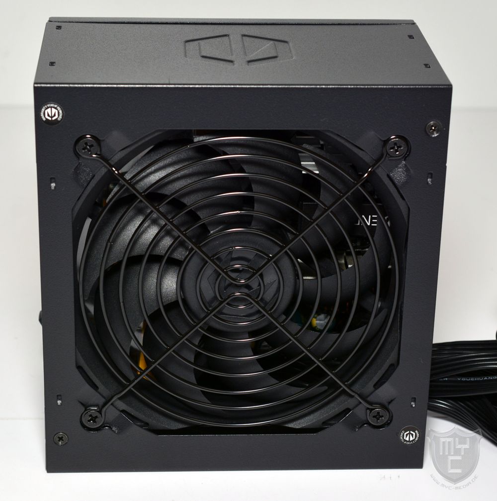 Auf der Vorderseite des Netzteiles findet man neben dem obligatorischen Stromanschluss auch einen Powerschalter vor. Wo unterhalb des Stromanschlusses ein Aufkleber mit einem Hinweis auf die Effizienz sowie die Modellbezeichnung angebracht wurde, wurde oberhalb des Stromanschlusses der Luftauslass in das Netzteilgehäuse eingestanzt.