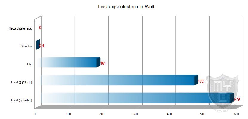 Das o. g. System inkl. Netzteil weist einen Strombedarf von etwa 170 Watt (IDLE) bis ca. 560 Watt (Volllast übertaktet) auf. Dieser kann jedoch je nach verwendetem Netzteil unterschiedlich sein. Unter Volllast wird besonders auf die Stabilität der Spannungen geachtet.