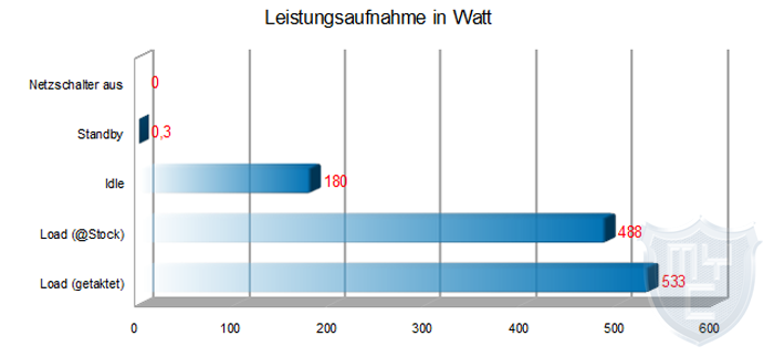 Das o.g. System inkl. Netzteil weist einen Strombedarf von etwa 180 Watt (IDLE) bis ca. 540 Watt (Volllast übertaktet) auf. Dieser kann jedoch je nach verwendetem Netzteil unterschiedlich sein. Unter Volllast wird besonders auf die Stabilität der Spannungen geachtet.