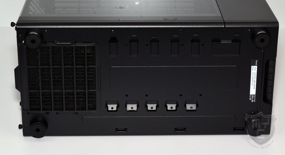 Auf der Gehäuseunterseite hat Fractal Design im hinteren Bereich einen abnehmbaren Staubfilter verbaut, welcher den Lufteinlass für das Netzteil vor eindringendem Staub schützt. Für einen sicheren Stand sorgen vier gummierte Kunststofffüße. Wie wir es schon von dem Powertaster und den Anschlüssen des I/O-Panels her kennen, wurden auch die vier Standfüße goldfarben abgesetzt.