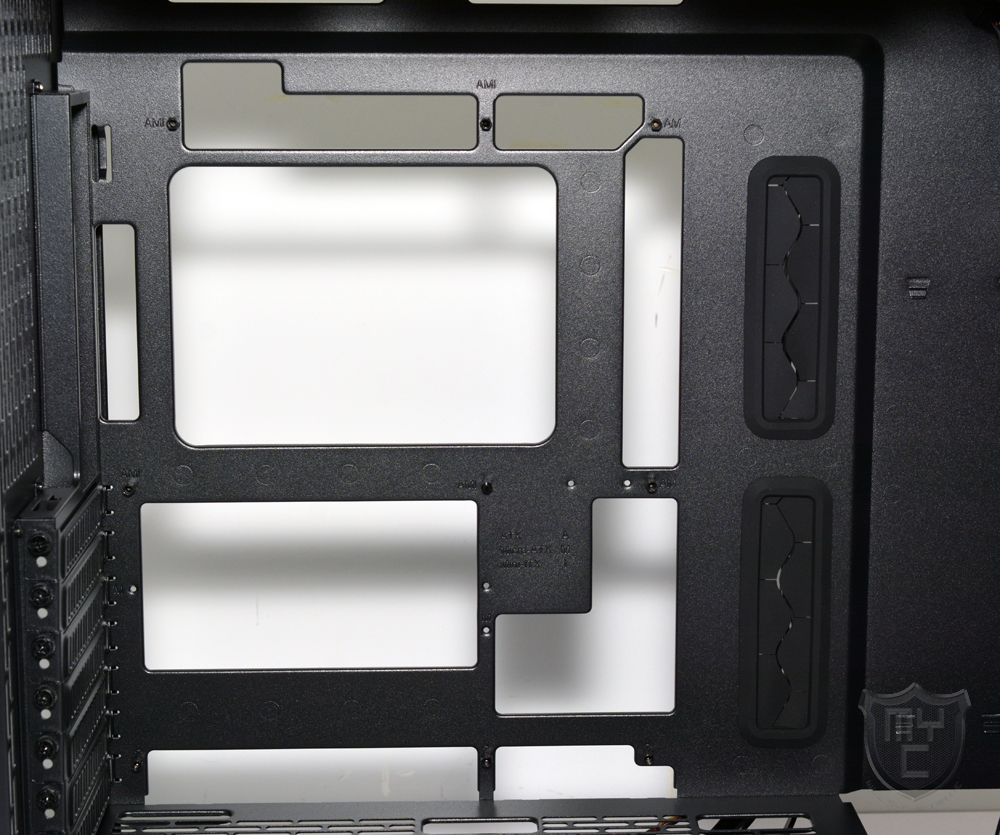 Neben den hierzu notwendigen Aussparungen wurde der Mainboardschlitten auch mit gummierten Kabeldurchführungen sowie einer großen Aussparung zur einfachen Kühlermontage ausgestattet.