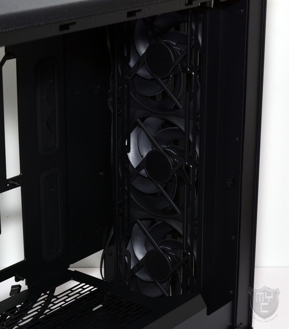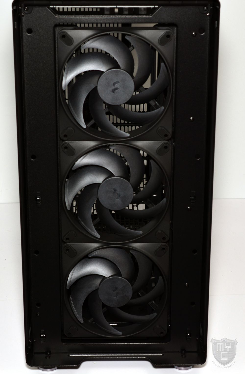 Nimmt man die Frontblende vom Gehäusekorpus ab, so hat man einen freien Blick auf die drei schon vorinstallierten 140-mm-Lüfter aus der hauseigenen Momentum-Lüfterserie.