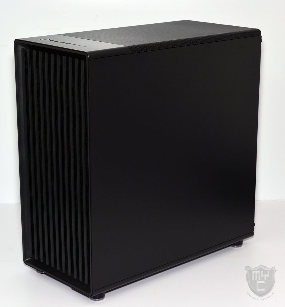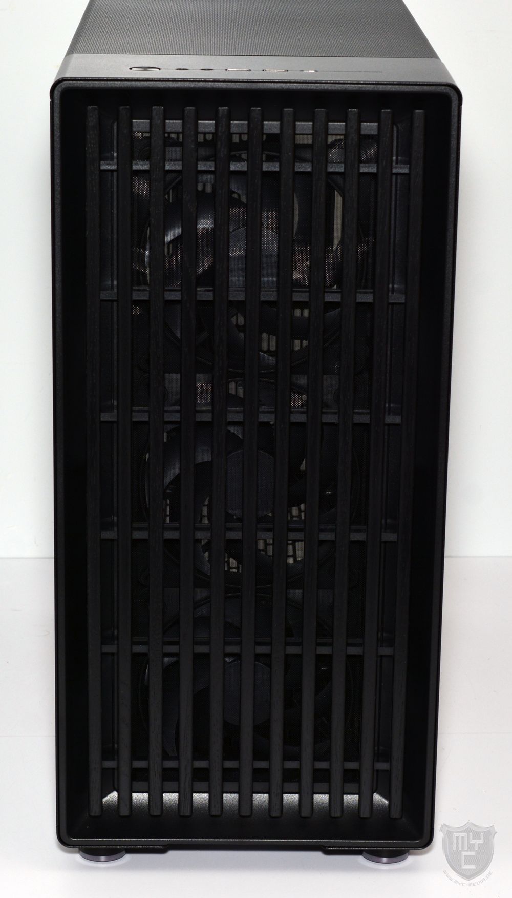 Dieses besondere Design erzielt Fractal Design durch die Gehäusefront, bei welcher in eine abgeschrägte Kunststoffumrandung 11 aus schwarz eingefärbten Eiche-Stäbe eingefasst wurden.