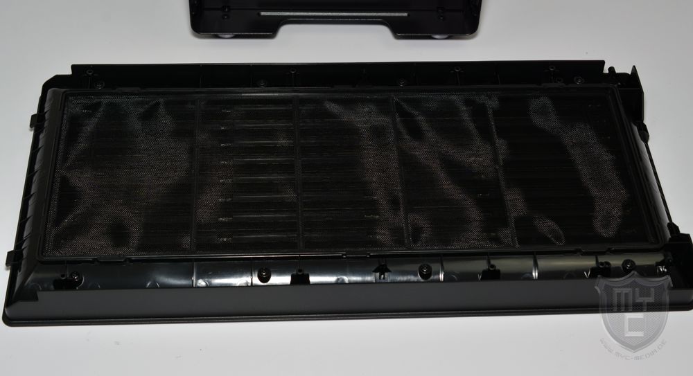 Die aus schwarzem Kunststoff gefertigte Front ist vertieft in den Metallkorpus des North XL – Momentum Edition Gehäuses eingefasst und wurde auf der Rückseite mit einem abnehmbaren Staubfilter ausgestattet.