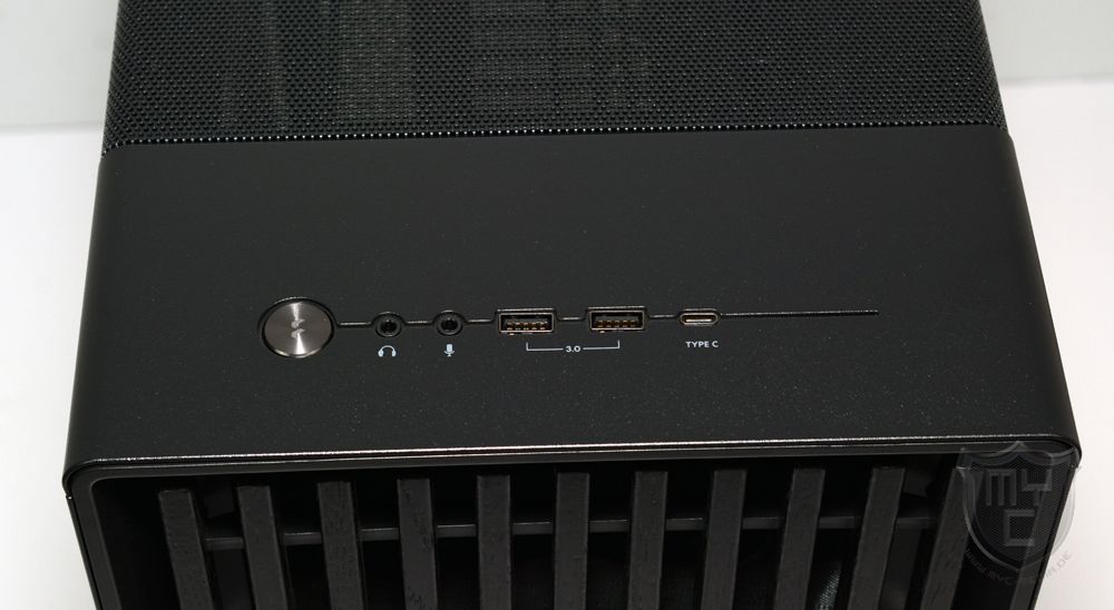 Um das Design der Gehäusefront nicht zu zerstören, hat Fractal Design das I/O-Panel in den vorderen Bereich der Gehäuseoberseite verlegt. Neben dem obligatorischen Power- und Resetschalter sowie zwei Audioanschlüssen hat Fractal Design an dieser Stelle auch zwei USB 3.0 Anschlüsse verbaut. Zudem findet man an dieser Stelle auch einen USB 3.1 Gen2 Type C Anschluss vor.