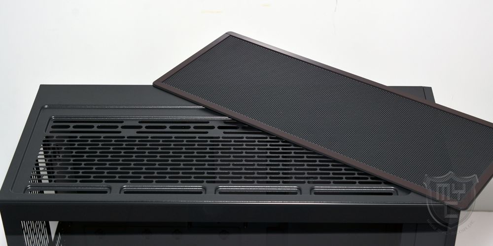 Neben dem I/O-Panel hat Fractal Design die Gehäuseoberseite mit einem abnehmbaren und aus robustem Metall gefertigten Mesh-Gitter ausgestattet, welches zugleich als Staubfilter für den darunter befindlichen Luftauslass dient.