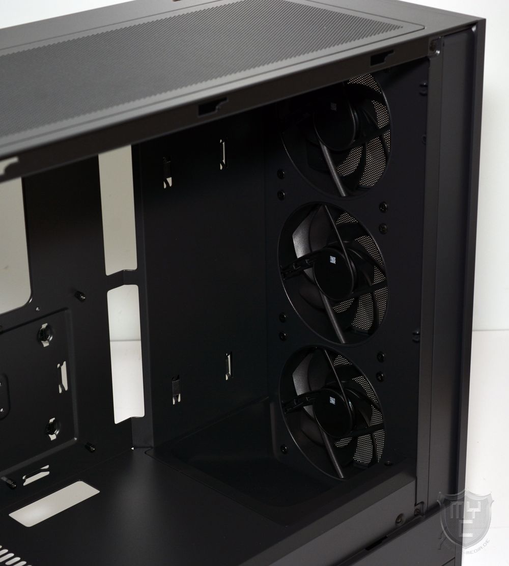 Nimmt man die Frontblende, deren Mesh-Gitter zugleich als Staubfilter fungiert, vom Gehäusekorpus ab, so hat man einen freien Blick auf die drei vorinstallierten 120-mm-Lüfter.