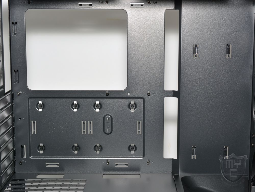 In den Mainboardschlitten wurde neben Kabeldurchführungen, bei welchen leider auf eine Gummierung verzichtet wurde, auch eine große Aussparung eingearbeitet, welche zur einfachen Kühlermontage dient.