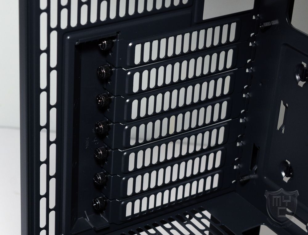 Die eingesetzten Erweiterungskarten dürfen bis zu 416 mm lang sein und können dank der eingesetzten Rändelschrauben zwar auch ohne Werkzeug montiert werden, jedoch muss man vor der Montage erst noch die Kunststoffabdeckung, welche einen Blick auf die Schrauben von der Gehäuserückseite aus verhindert, vom Gehäusekorpus abnehmen.