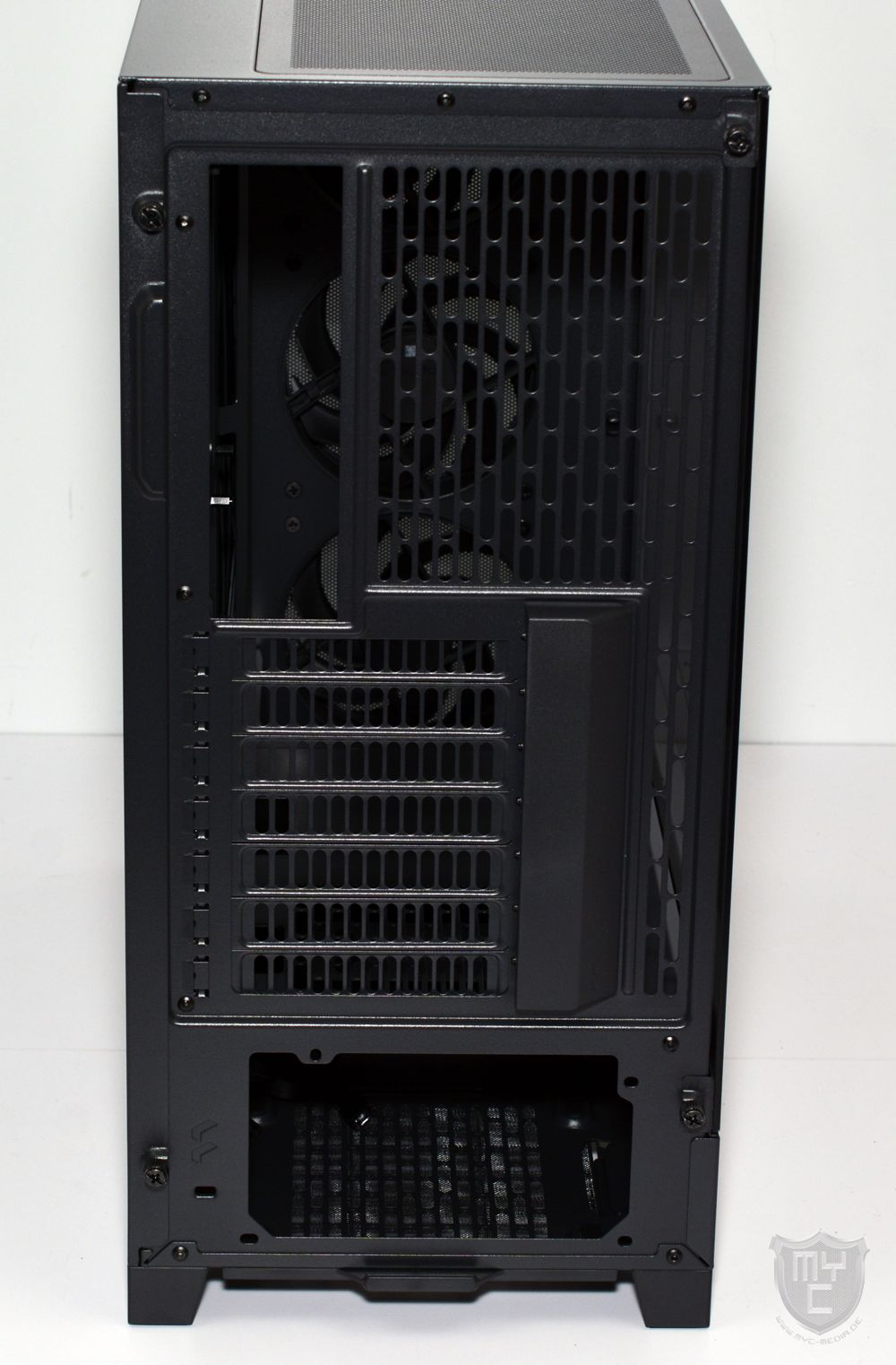Betrachtet man das Gehäuse einmal von der Rückseite aus, so findet man direkt unterhalb des Gehäusedeckels den Ausschnitt für das I/O-Shield sowie einen weiteren Luftauslass vor, an welchem man einen weiteren 120-mm-Lüfter verbauen kann.