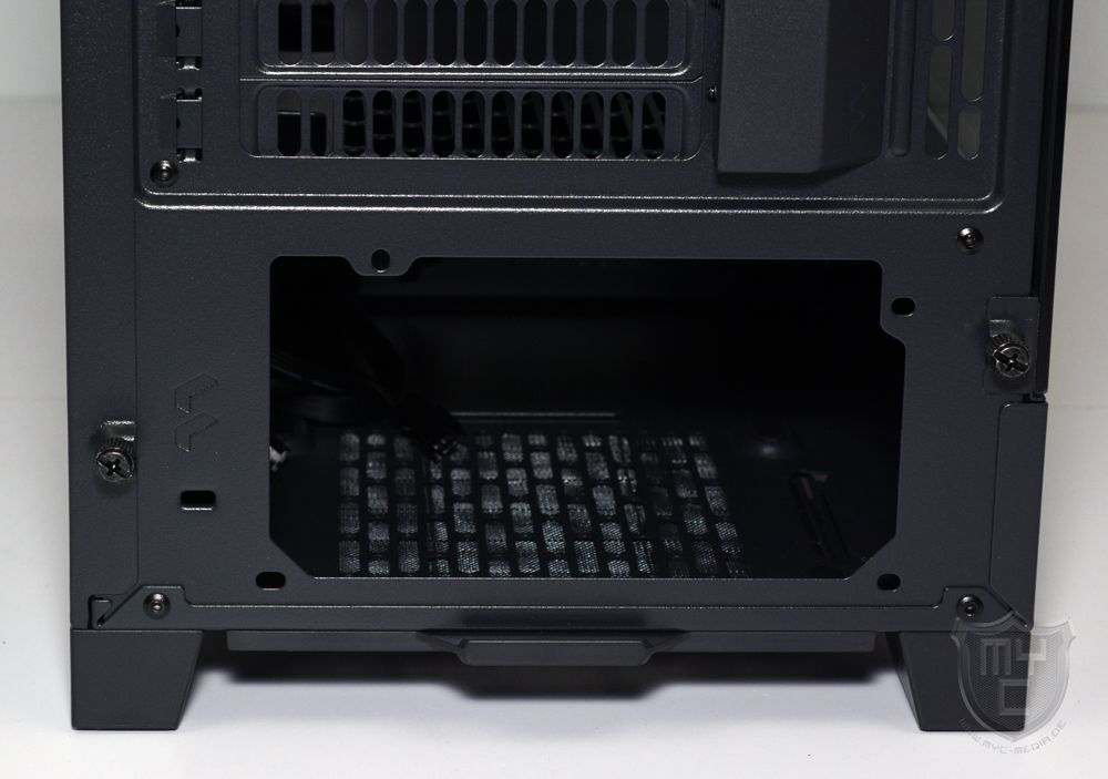 Der Einbauplatz für das ATX-Netzteil befindet sich am Gehäuseboden und verfügt über vier Montagebohrungen, durch welche sich das Netzteil grundlegend nur in einer Richtung montieren lässt.