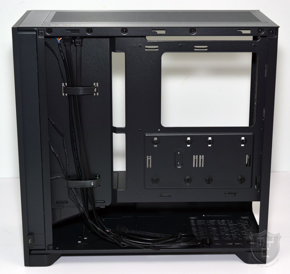 Passend zum aufgeräumten Innenraum hat Fractal Design auch die Rückseite des Mainboardschlittens klar strukturiert und im vorderen Bereich mit einer Kabelführung ausgestattet.