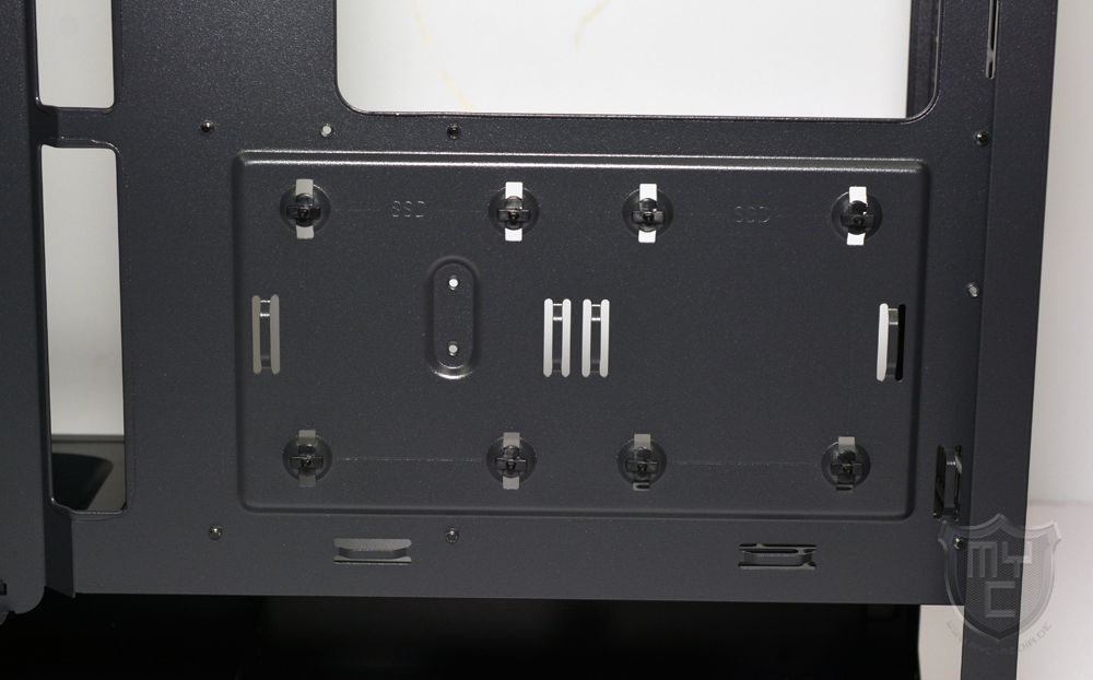 Auf der Rückseite des Mainboardschlittens wurden unterhalb der Aussparung, welche der einfachen Kühlermontage dient, Montagepunkte eingearbeitet, welche seitens Fractal Design schon mit Kunststoffpins ausgestattet wurden, welche eine werkzeuglose Montage von bis zu zwei 2,5″-Laufwerke ermöglichen.