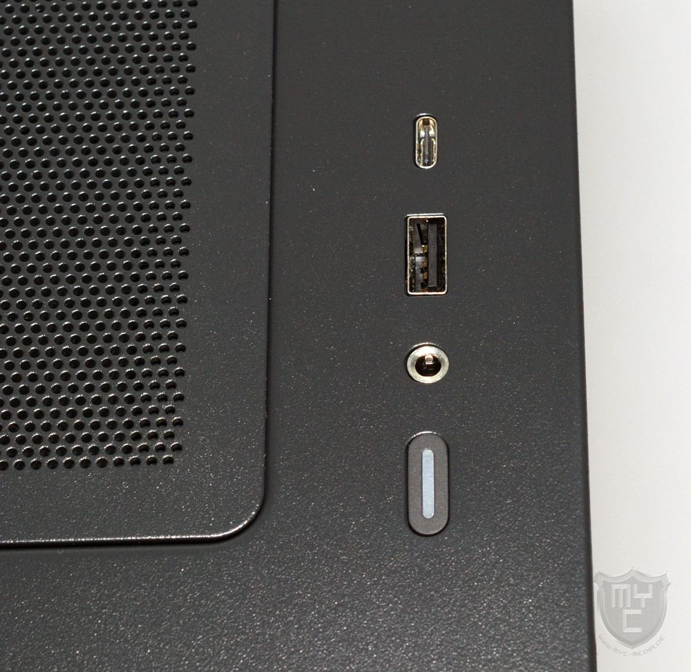 Um das Design der Gehäusefront nicht zu unterbrechen, hat Fractal Design nicht nur auf ein eingelassenes Logo verzichtet, sondern auch das I/O-Panel wurde in den vorderen Bereich der Gehäuseoberseite verlegt. Neben dem obligatorischen Powerschalter sowie einem vierpoligen Audioanschluss hat Fractal Design an dieser Stelle auch einen USB 3.0 Type-A-Anschluss verbaut. Zudem findet man an dieser Stelle auch einen USB 3.0 Type-C-Anschluss vor.