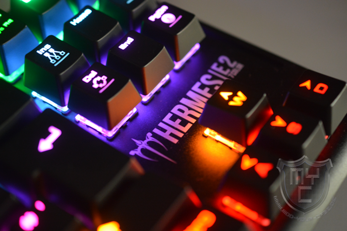 Auf große Beleuchtungseffekte hat Gamdias bei der Hermes E2 leider verzichtet. Dies fällt einem schon bei einem ersten Blick auf die beleuchteten Tasten auf, denn im Gegensatz zu vielen anderen Herstellern verbaut Gamdias unter den Tasten keine RGB-LED, sondern in jeder Tastenreihe eine andersfarbige LED. Zudem werden nicht alle Tasten durchgehend beleuchtet. Dies liegt daran, dass Gamdias die Beleuchtung der Rollen-Taste sowie auch der Capslock-Taste und Windows-Taste als entsprechende Status-LED nutzt. Diese LEDs leuchten somit nur, wenn die entsprechende Funktion aktiviert ist.