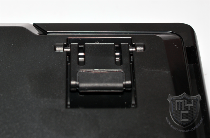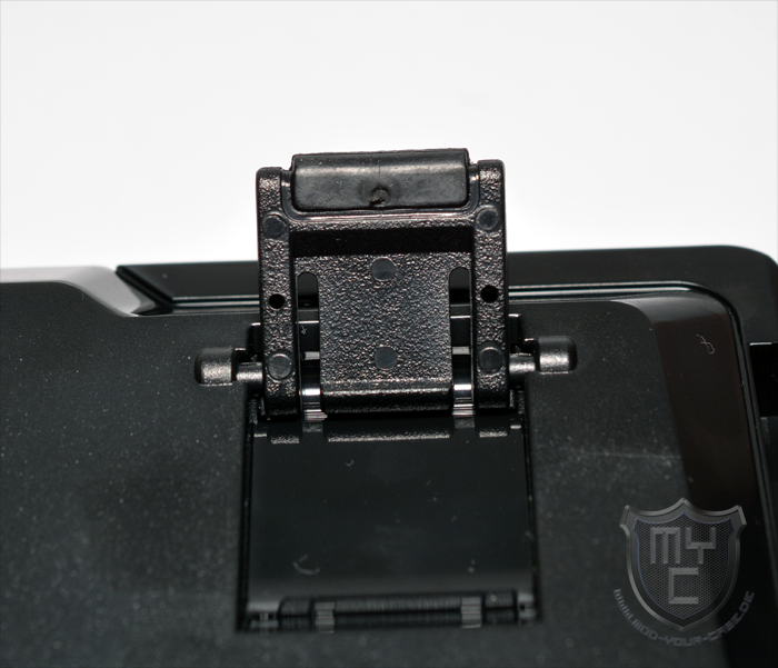 Da die Tastatur nur an der vorderen Kante mit Gummifüßen ausgestattet wurde, liegt sie leider nicht besonders fest auf dem Schreibtisch. Das Handling kann an dieser Stelle deutlich verbessert werden, wenn man die im hinteren Bereich verbauten Standfüße ausklappt, welche über eine entsprechende Gummierung verfügen.