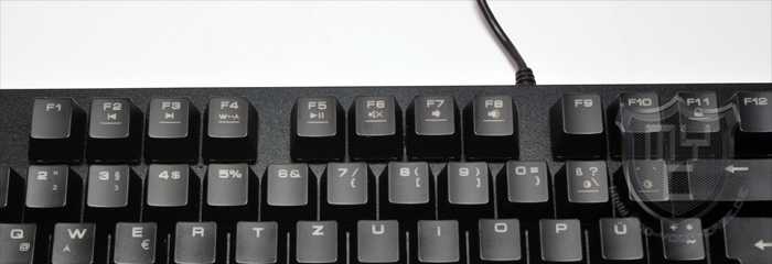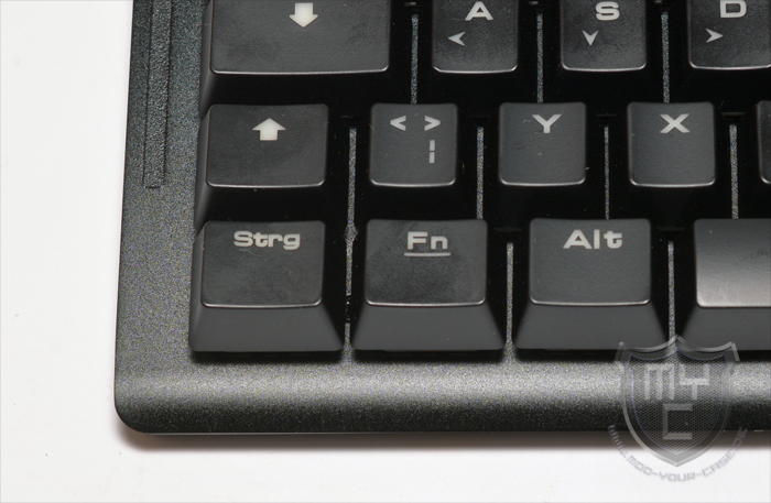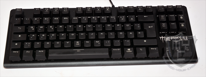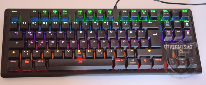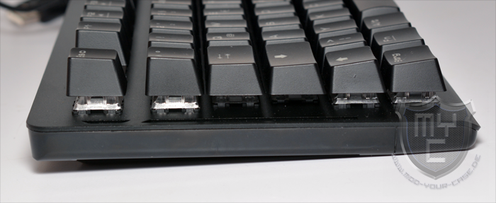 Wie man es von den meisten anderen Tastaturen am Markt kennt, sind die aufgesetzten Tastenkappen jedoch überwiegend im oberen Bereich beleuchtet, wodurch Tasten mit einer zweizeiligen Beschriftung nicht perfekt ausgeleuchtet werden.