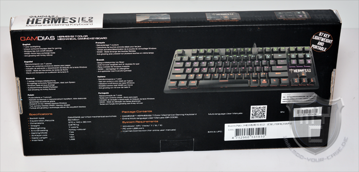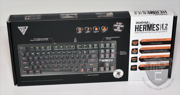 Die Hermes E2 wird von Gamdias in einer Verpackung geliefert, welche in einem schwarz/weißen Design gehalten ist. Auf der Verpackungsvorderseite wurde nicht nur ein großes Produktbild abgedruckt, sondern auch noch eine Auflistung der wichtigsten Details und Features.