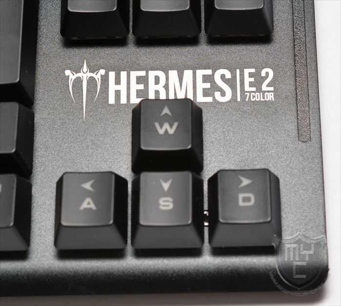 Das Tastaturgehäuse wurde auf der Oberseite mit einer schwarzen Aluminiumplatte bestückt. Um das Design nicht ganz zu schlicht wirken zu lassen, wurde nicht nur der Hermes E2 Schriftzug samt Logo oberhalb der Pfeiltasten aufgedruckt, sondern es wurden auch kleine Aussparung an der linken und rechten Seite der Tastaturoberseite eingearbeitet.