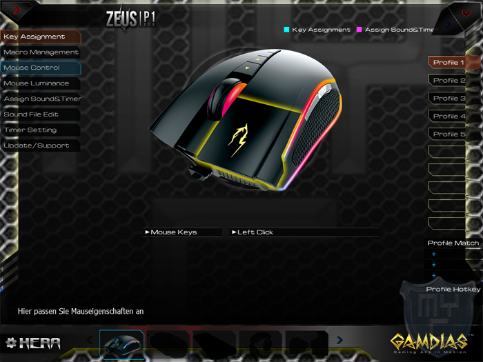 Im ersten Softwareabschnitt “Key Assigment” kann man wie die Bezeichnung schon vermuten lässt alle Einstellungen vornehmen, welche der Belegung der verschiedenen Tasten betrifft. Bei der ZEUS P1 können in diesem Softwareabschnitt bis auf die linke Maustaste alle Tasten frei belegt werden. Hierkönnen nicht nur verschiedene vordefinierte Funktionen ausgewählt, sondern auch Tastaturbelegungen und eigene Makros abgerufen werden.