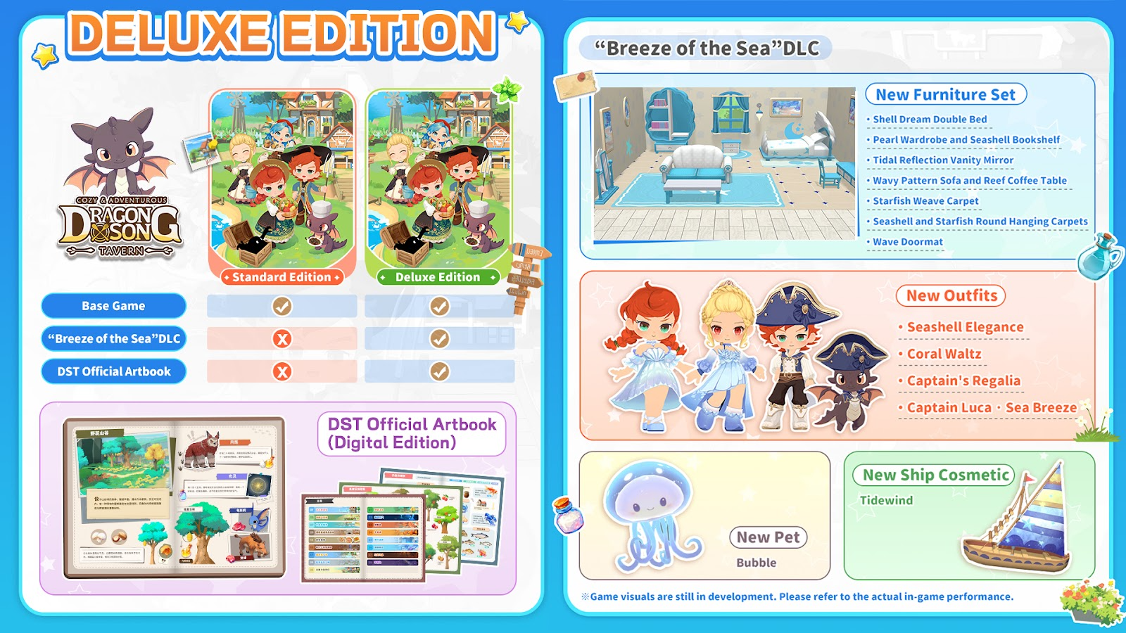 Zusammen mit der vollständigen Veröffentlichung hat das Team bestätigt, dass auch die DLC-Belohnungen der Deluxe Edition verfügbar sein werden – darunter der DLC „Breeze of The Sea“ mit einem neuen Möbelset, Outfits, Haustieren und Schiffskosmetik sowie dem offiziellen DST-Artbook (digitale Ausgabe).