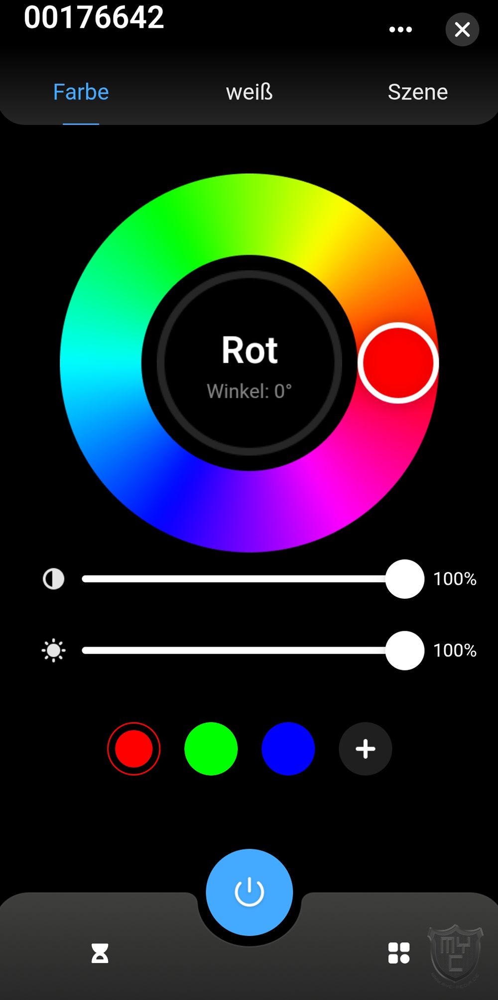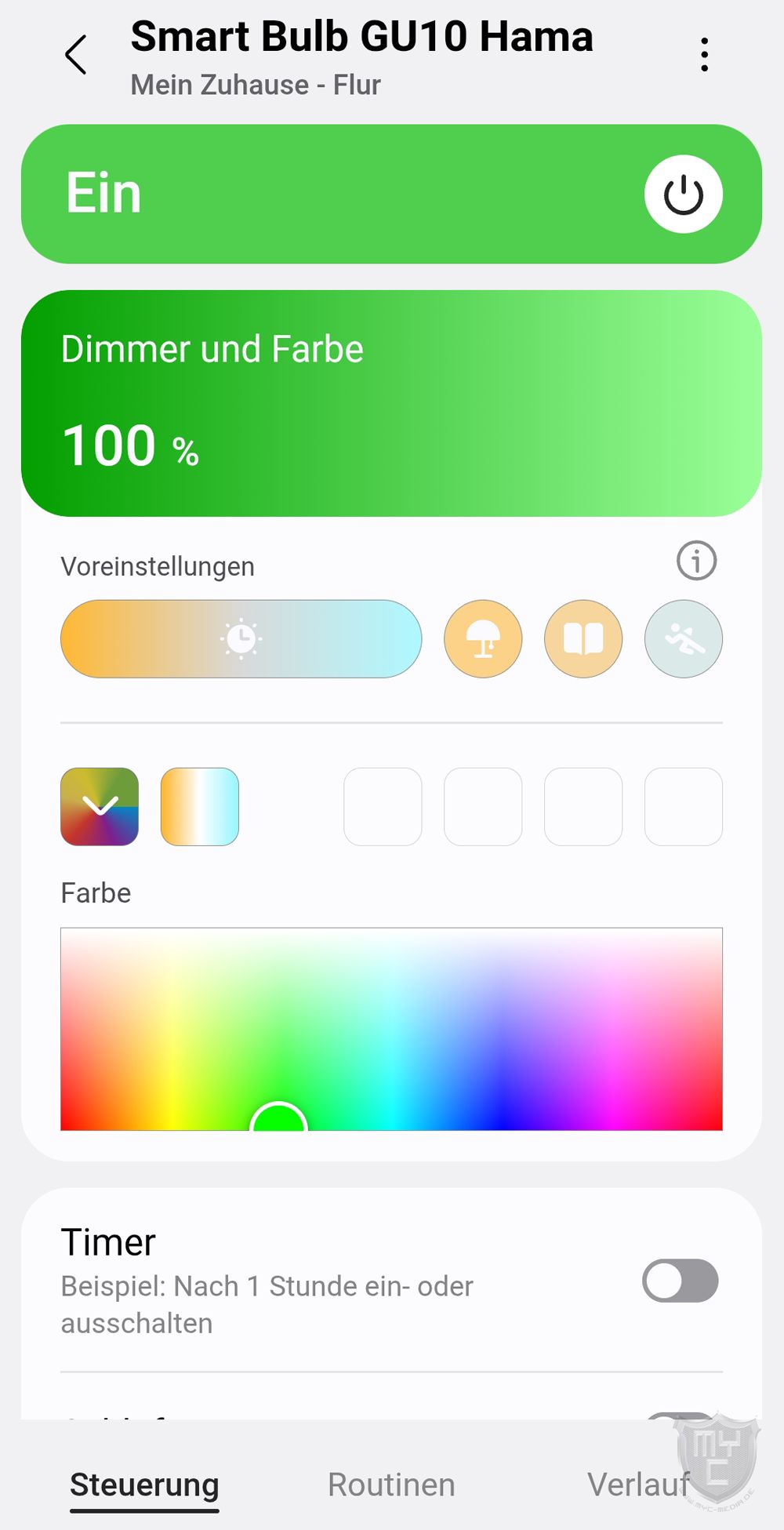 Über den Menüpunkt “Farbe” gelangt man auf eine Übersichtsseite, über welche sich das Leuchtmittel nicht nur einschalten und dimmen lässt, sondern man kann auch eine beliebige Farbe einstellen.