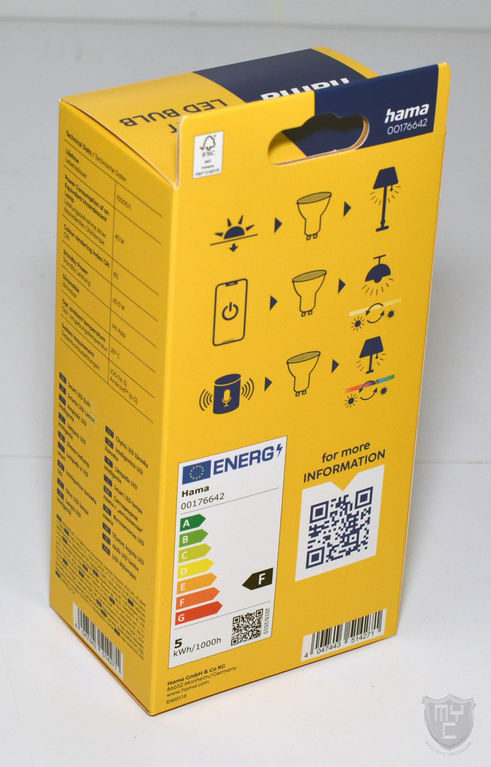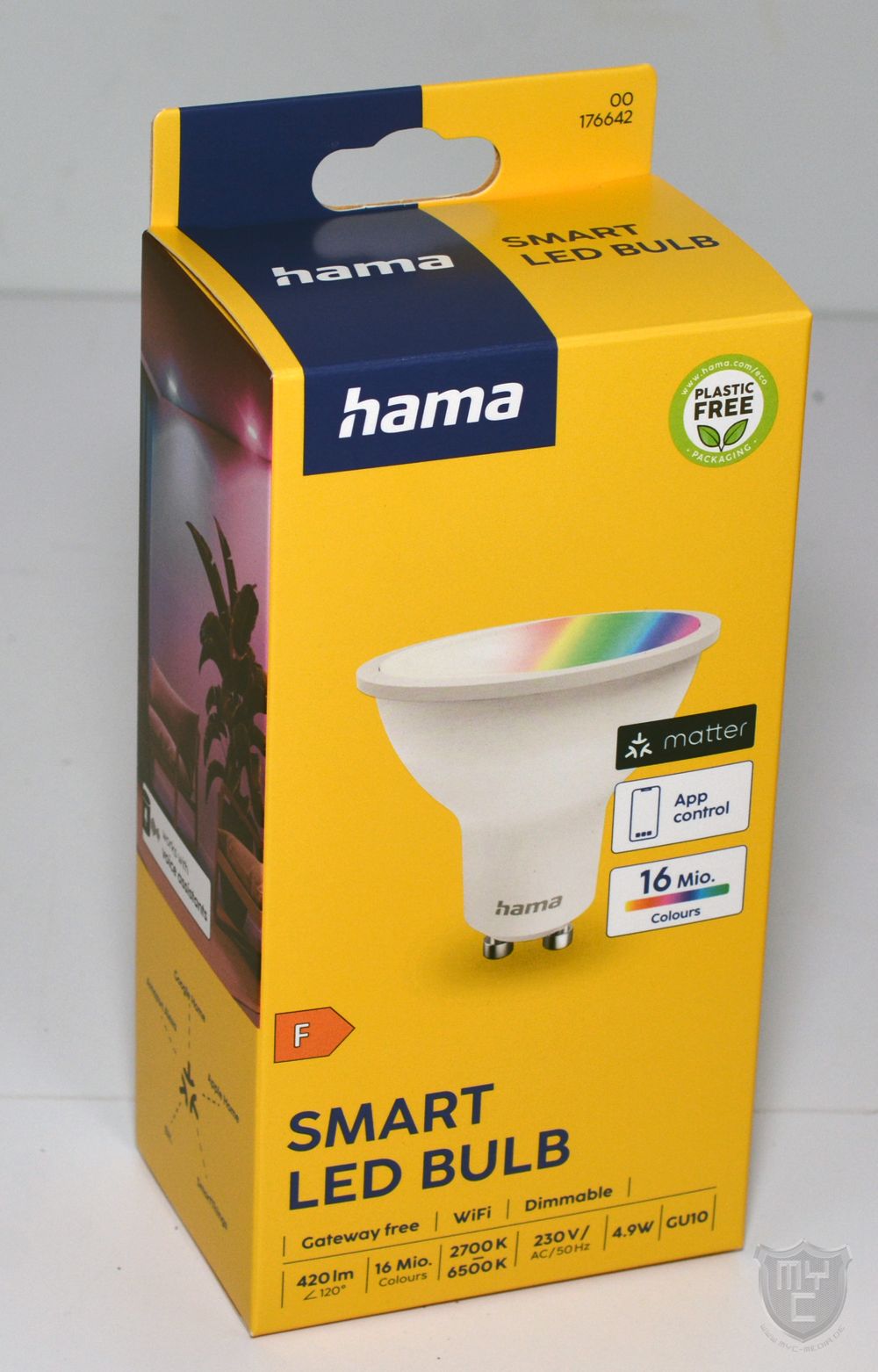 Das smarte 00176642 GU10 Leuchtmittel wird von Hama in einer gelben Verpackung geliefert, welche auf der Vorderseite neben einem Produktbild auch mit einem Hinweis auf die wichtigsten Features bedruckt wurde.
