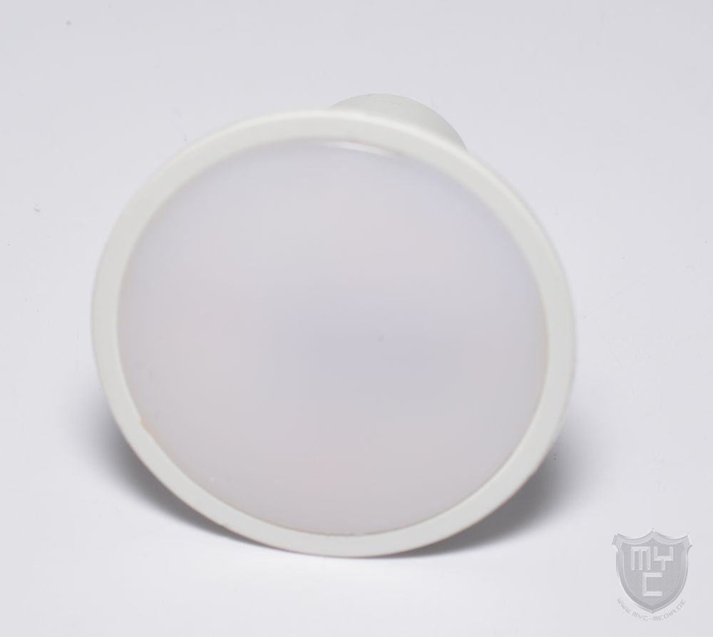 Mit einem Blick auf die Vorderseite des Leuchtmittels findet man eine in das Gehäuse eingeklebte Diffusorscheibe vor, welche keinen Blick auf die verbauten LEDs zulässt.