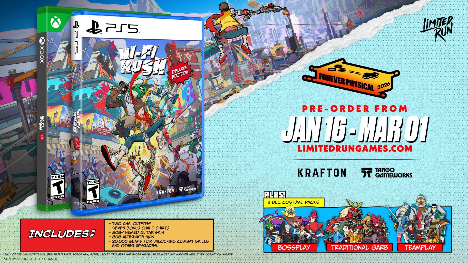 KRAFTON, Inc. gibt bekannt, dass die physischen Konsolen-Editionen von Hi-Fi RUSH ab sofort vorbestellt werden können. Das von Kritikern gefeierte Rhythmus-Action-Spiel ist bekannt für seinen einzigartigen Stil, musikgetriebene Kämpfe und seine besondere Animation. Die physische Veröffentlichung erfolgt in Partnerschaft mit Limited Run Games.