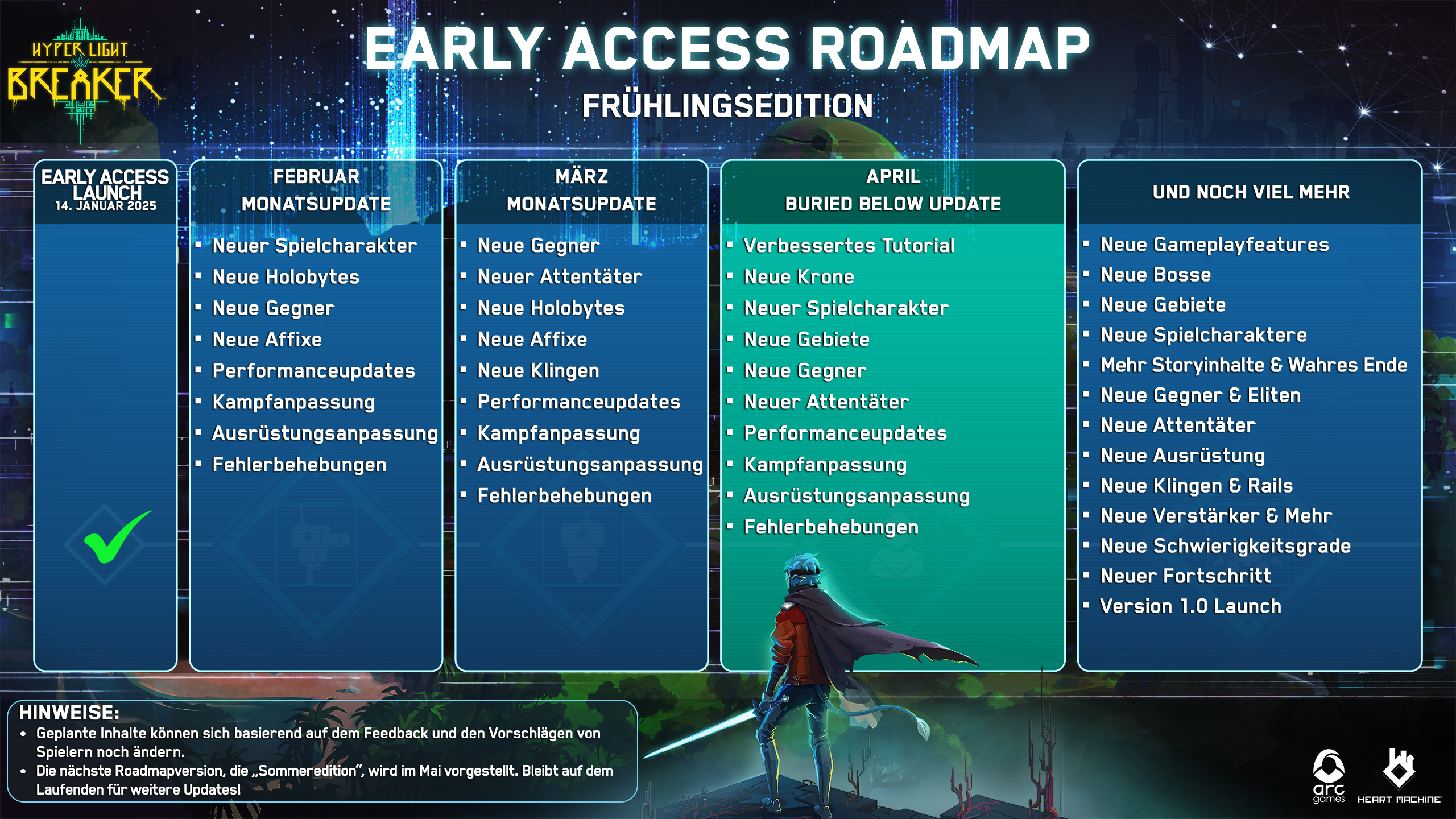 Die Frühlingsedition der Early Access-Roadmap enthüllt Inhaltsupdates für diesen Monat bis April – und verrät, was Spieler im Early Access erwarten können. Das erste Monatsupdate für Hyper Light Breaker im Early Access erscheint nächsten Dienstag, 18. Februar (Details unten), im April erscheint das große Inhaltsupdate „Buried Below“. Die nächste Roadmap, die „Sommeredition“ mit Updates für Mai bis Juli, wird im Mai veröffentlicht.