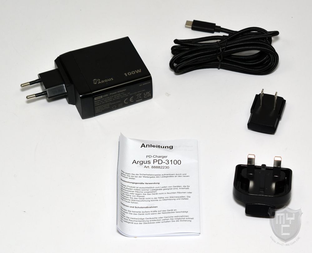 Durch den schon vorinstallierten Euroadapter muss man den Argus PD-3100 USB-Charger nur in eine Steckdose einstecken und das gewünschte Endgerät mittels des mitgelieferten USB-C-Kabels mit dem Charger verbinden. Die im Charger sowie dem zu ladenden Gerät integrierte Ladeelektronik handeln die optimale Ladespannung im Anschluss automatisch aus.