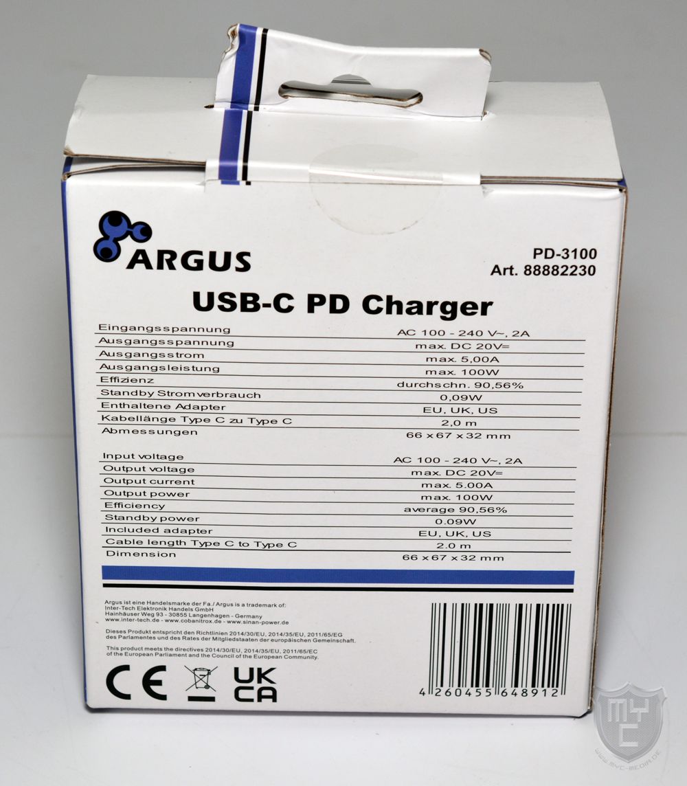 Das Argus PD-3100 USB-Netzteil wird von Inter-Tech in einer Verpackung geliefert, welche in einem hellen Grunddesign gehalten ist. Auf der Verpackungsvorderseite wurde neben einem Produktbild des enthaltenen Chargers auch ein Hinweis auf dessen maximale Ausgangsleistung sowie die enthaltenen Adapter abgedruckt.