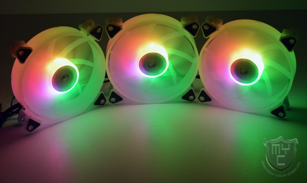 Um die Lüfter, welche durch Ihre recht seltene Farbgebung schon im ausgeschalteten Zustand auffallen, noch auffälliger zu gestalten, hat Inter-Tech im Bereich der Lüfternabe acht adressierbare RGB-LEDs verbaut.