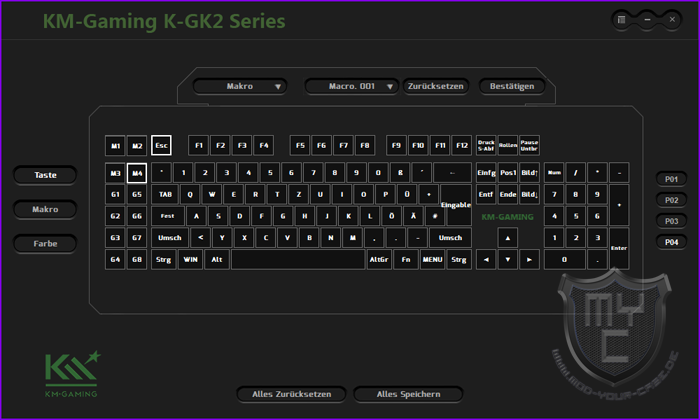 KM-Gaming hat die K-GK2 auf der linken Seite mit insgesamt 12 Zusatztasten ausgestattet. Neben vier Tasten, über welche man das gewünschte Profil auswählen kann, wurden hier auch noch sechs frei belegbare G-Tasten verbaut. In Kombination mit der bereitgestellten Software können jedoch nicht nur diese sechs tasten, sondern auch alle anderen Tasten frei belegt werden.
