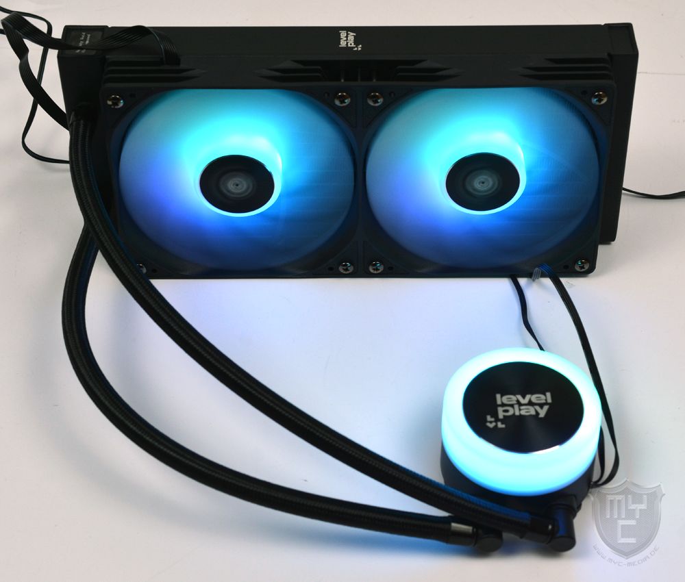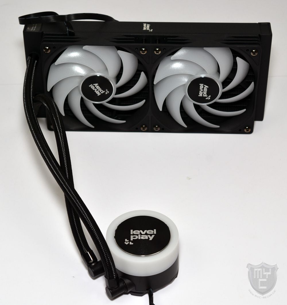Mit der Combat Liquid 240 SE hat Levelplay eine 240-mm-AiO-Wasserkühlung in seinem Sortiment, welche in unserem Test neben einem schon vormontierten Einzelrahmenlüfter auch mit einer ansprechenden Optik überzeugen konnte. Was die gebotene Leistung angeht, bringt die 240 mm große AiO-Wasserkühlung eine Kühlleistung mit, welche ausreichend ist, um ein Mitteklasse-Gaming-System auch an warmen Sommertagen problemlos kühlen zu können. Die gebotene Leistung erkauft sich die AiO-Wakü jedoch mit einer recht hohen Geräuschkulisse. Wo die eingesetzte Pumpe auf einem angenehmen Geräuschlevel arbeitet, gehört der vorinstallierte Lüfter zu den lauteren Modellen seiner Art. Zudem ist die seitens Levelplay am Lüfter angebrachte Moosgummientkopplung so dünn ausgeführt, dass die vorinstallierten Entkoppler soweit zusammengepresst werden, dass sie wirkungslos sind und der Lüfter ohne eine Entkopplung auf dem Radiator aufliegt. Das Einsatzgebiet der AiO-Wasserkühlung wird jedoch nicht nur durch die gebotene Kühlleistung begrenzt, sondern auch durch die gebotene Schlauchlänge, denn diese lässt keine Montage an der Gehäusefront eines größeren Gehäuses zu. Mit einem Blick auf die Optik überzeugt die Combat Liquid 240 SE AiO-Wasserkühlung nicht nur durch einen beleuchteten Einzelrahmenlüfter sowie die ebenfalls beleuchtete Pumpeneinheit, sondern auch durch die Möglichkeit, das auf der Pumpeneinheit angebrachte Diffusorelement und somit auch das darauf befindliche Levelplay Logo beliebig ausrichten zu können. Neben der von uns in diesem Test herangezogenen, schwarzen Version, bietet Levelplay die Combat Liquid 240 SE auch in einer weißen Variante an. Preislich liegt die von uns getestete Combat Liquid 240 SE aktuell bei knapp 70 € 🛒.