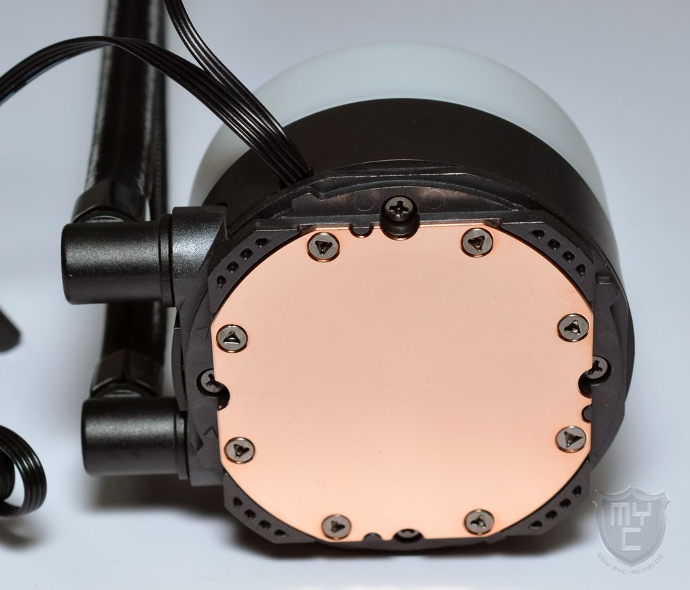 Die Combat Liquid 240 SE AiO-Wasserkühlung wurde mit einer Pumpeneinheit ausgestattet, welche mit einer Bauhöhe von 41 mm relativ flach ausfällt, optisch jedoch nicht gerade unauffällig daher kommt. Das zylinderförmige Gehäuse der Pumpeneinheit wurde in der unteren Hälfte aus schwarzem Kunststoff gefertigt.
