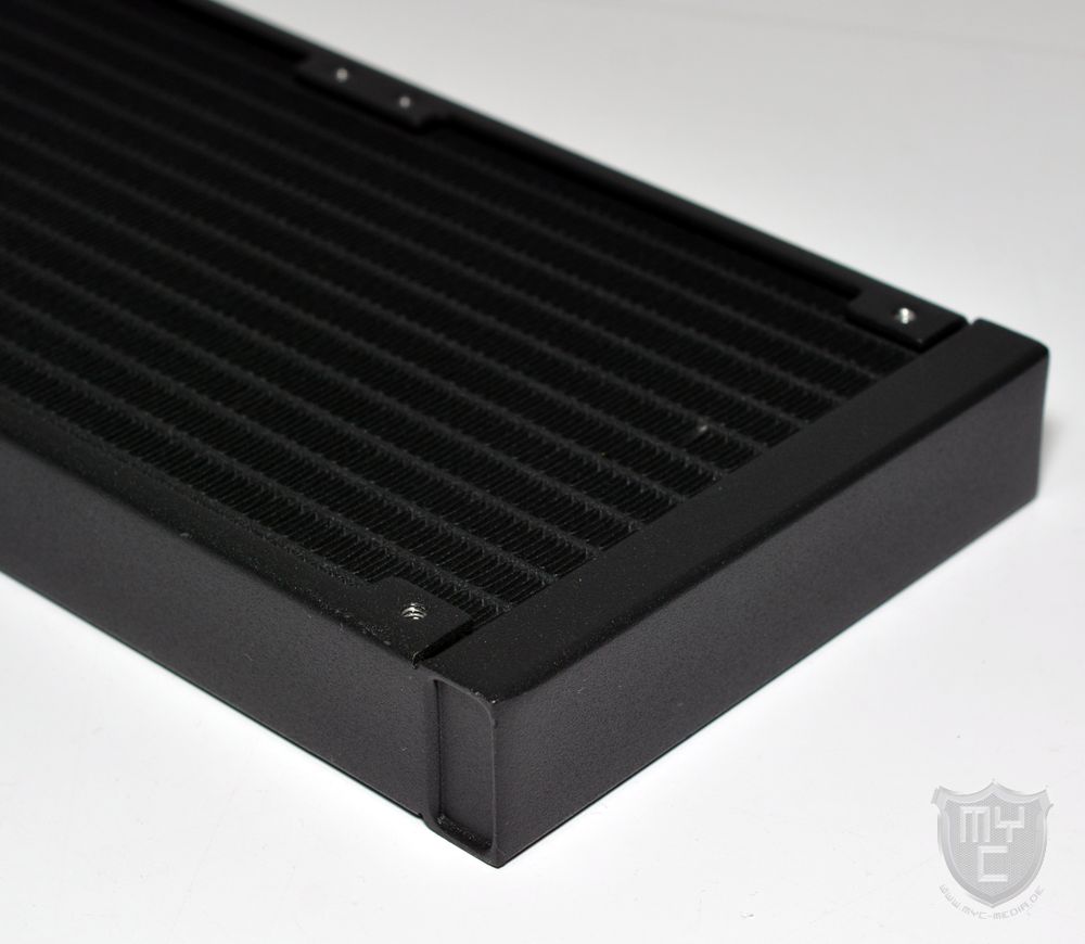 Zur Lüfter- sowie auch der Radiatormontage selbst wurde der Radiator auf der Ober- und Unterseite mit M3-Montagegewinden ausgestattet. Einen Lamellenschutz, welcher die unter den Montagebohrungen befindlichen Kühlfinnen vor zu tief eingedrehte Schrauben schützt, sucht man an dieser Stelle jedoch leider vergebens.
